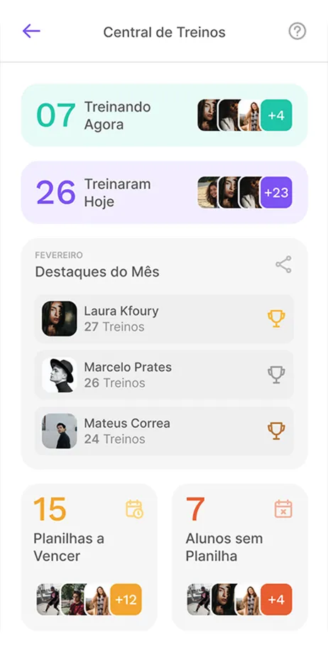 Tudo que você precisa saber em uma única tela, seja do celular ou do computador: quem está treinando em tempo real, planilhas a vencer e alunos em destaque.