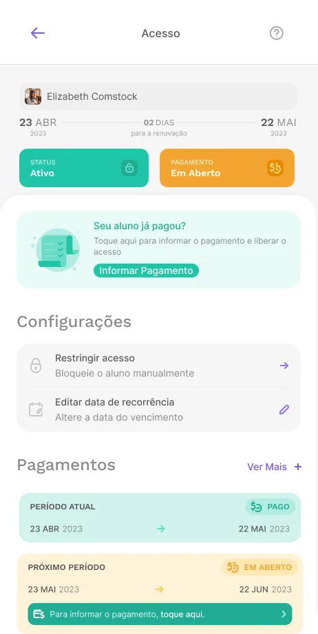 Controle de acesso do aluno automático por data de recorrência do pagamento